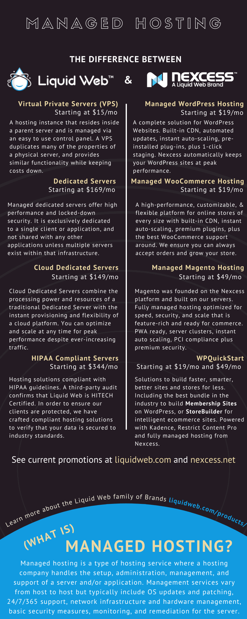 Nexcess is a fully managed hosting provider and a Liquid Web brand itself. If you’re looking for fully managed web hosting solutions for WordPress, Magento, or WooCommerce, Nexcess would be your first choice.