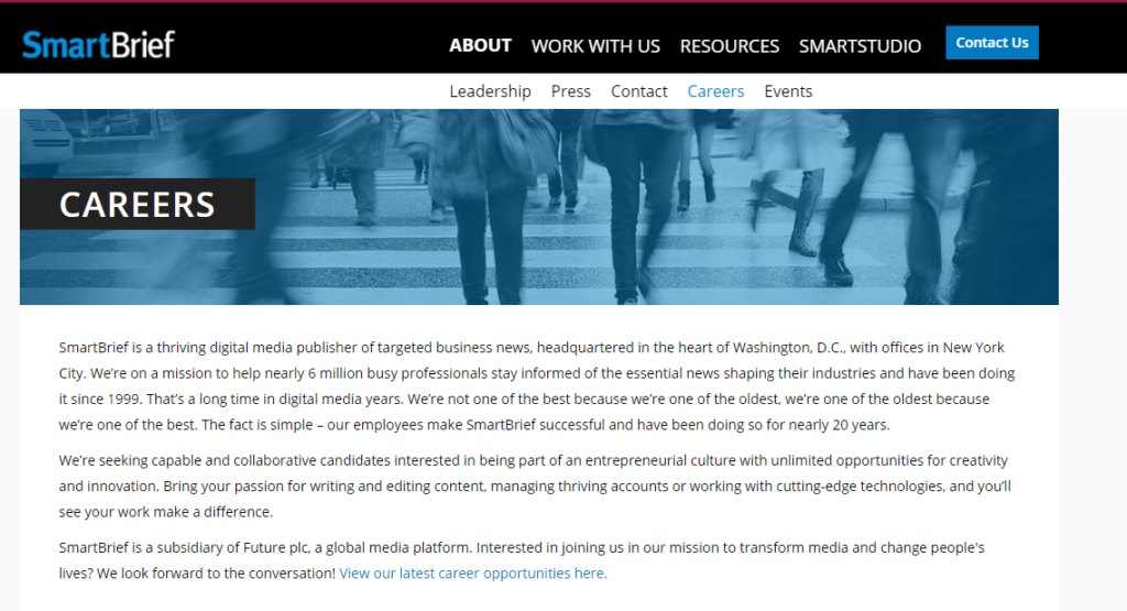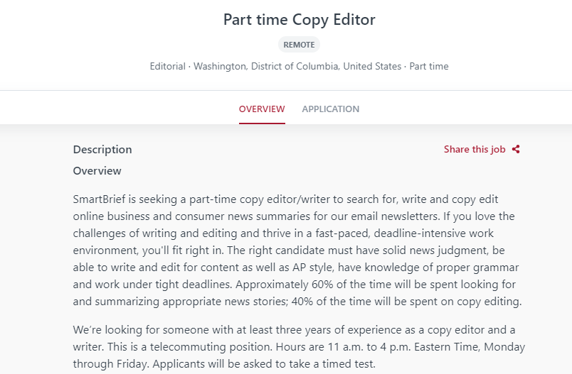SmartBrief is a digital media publisher and has openings for content editors and part-time copy-editors. They have detailed guidelines with job descriptions available on their site. The application process is quick, done, and you can expect a response from them within 48 hours. Here take a look at this: