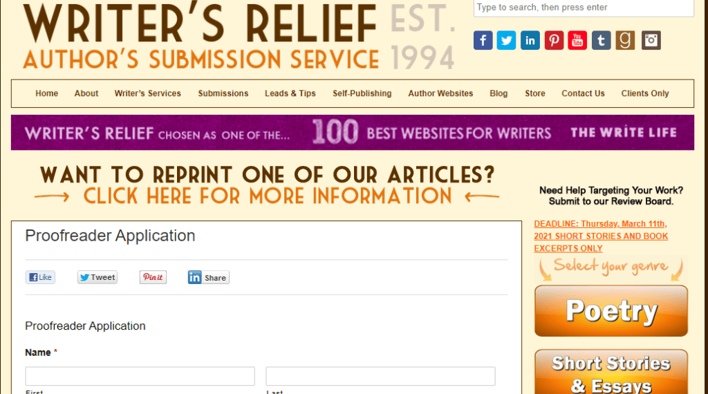 You cannot find a better site to showcase your creativity. Writer’s Relief gives creative writers a chance to get published and accept only 2% of applications sent by writers and proofreaders. It may be a hard nut to crack, but nothing can deter you if you have the right skills.