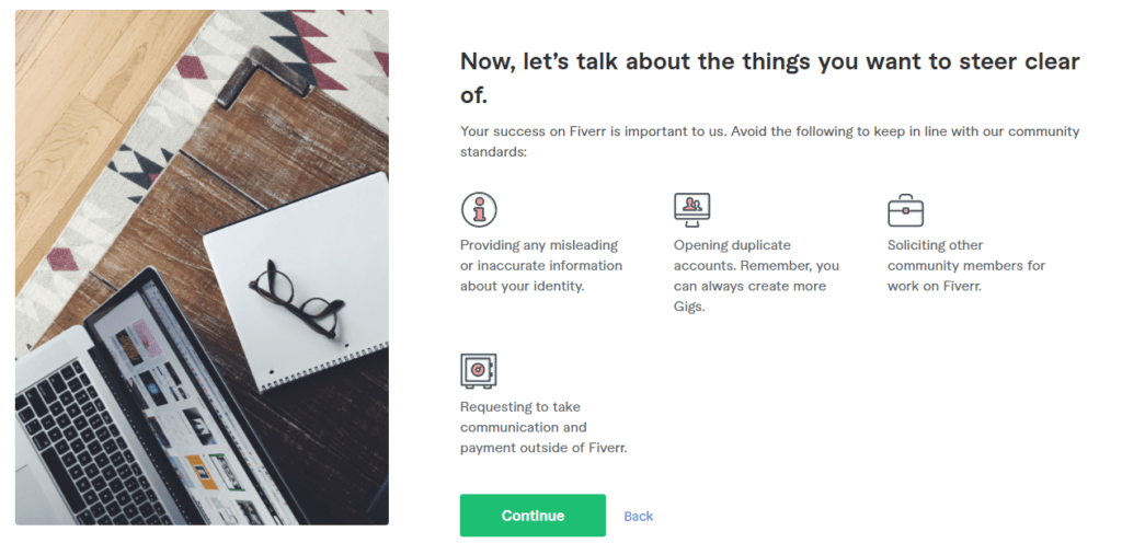 Interesting to note, this website also tells you what you shouldn’t do while selling your work online. Fiverr calls this the onboarding overview. Once you’re done, you’re ready to start selling.