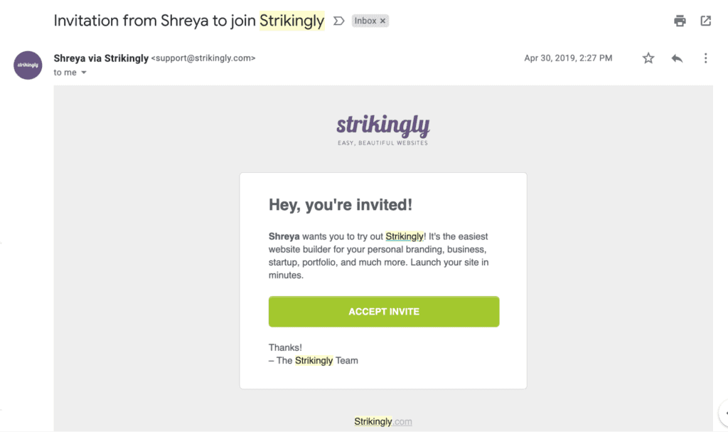Here’s the email received from a content marketer, Shreya Dalela, inviting me to sign up for a new Strikingly account.