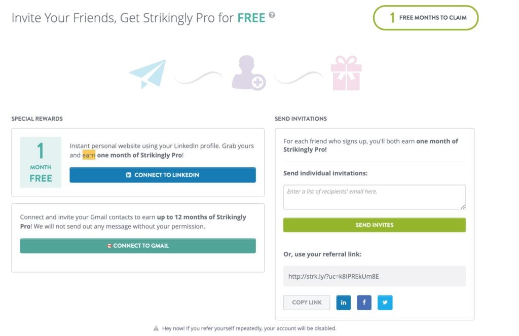 For instance, website builder Strikingly gets one month of its “Pro” plan for every new user that signs up. In its landing page below, you can see how the company rewards its users for even syncing their LinkedIn profile and Gmail account.
