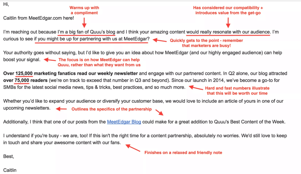 Here’s a friendly and considerate email that Lucia Quuu received from Caitlin at Meet Edgar. It led to a small partnership between these brands where they ended up sharing links to each other’s articles in their newsletters.