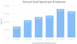 4. The average employee uses at least 8 apps, and the company spends an average of $2,884 in SaaS subscriptions on them. Depending on the company size, here’s how the average SaaS spend varies.