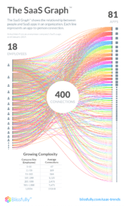 4. The relationship between an app and a person is complex – comprising aspects like access, data sharing, usage, spending, and the like. While the typical 200 to 500-person company uses 123 apps, it would have an average of 2,700 app-to-person connections.