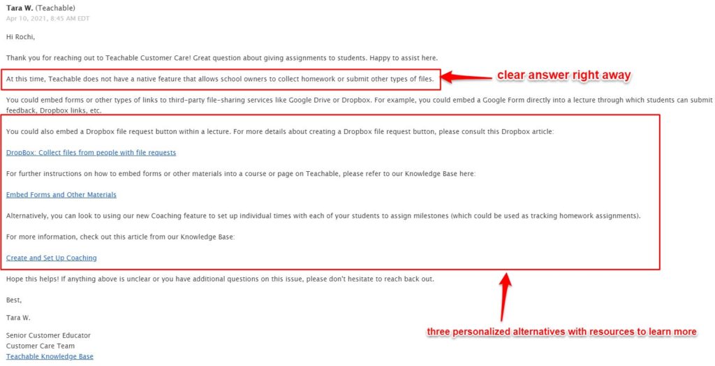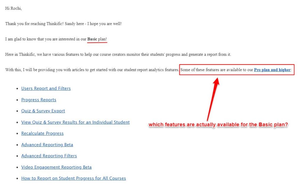 At Thinkific, I asked about the reporting analytics in the “Basic” plan. I was given a bunch of articles on the analytics available. The problem is some of these features are only available at Pro or higher plan. While the agent did specify this, it wasn’t specified which features are actually available in the basic plan. The response wasn’t personalized and I had a feeling that this response is actually a template copy-pasted for similar queries.