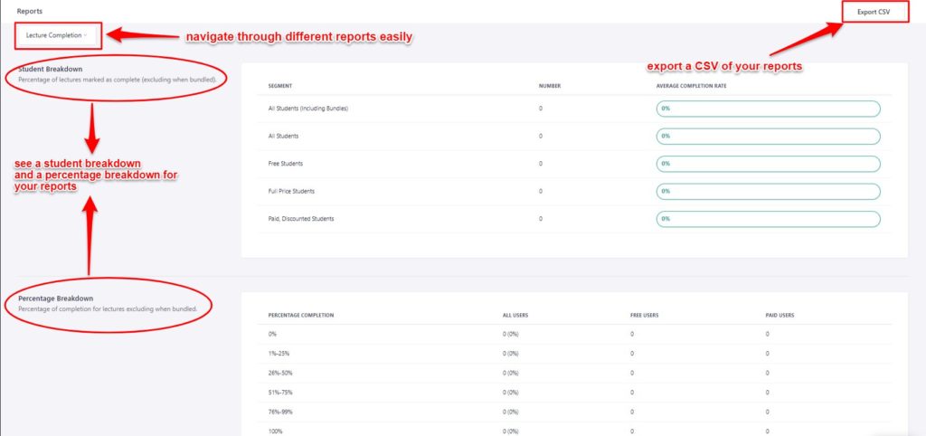 The dashboard also segments each data point into a student breakdown and a percentage breakdown. You can also export the CSV of the reports.