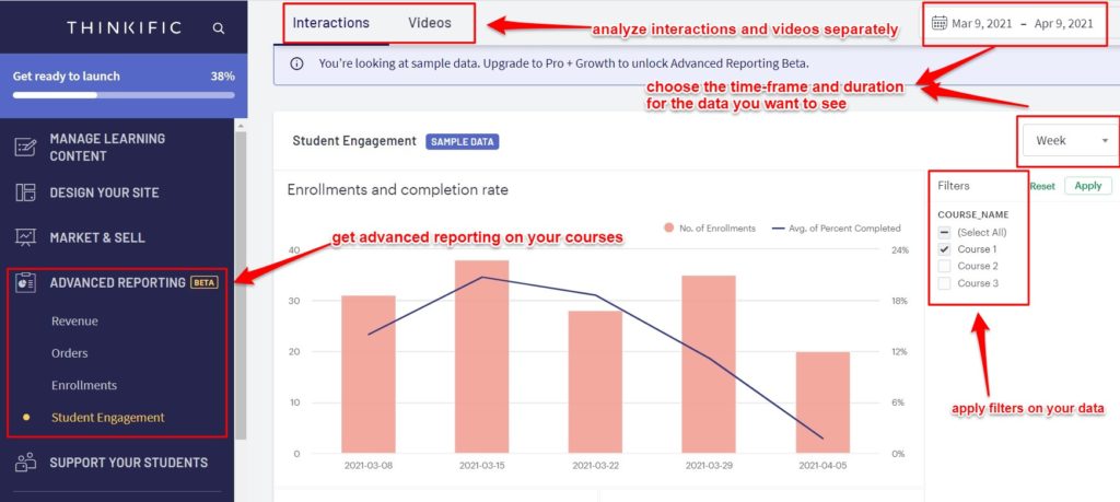 However, Thinkfic has an “Advanced Reporting” feature available that allows you to track revenue, student engagement, enrollments, and orders. This feature is currently in the Beta stage and is only available for Pro and Growth plans. This reporting also has advanced video analytics.