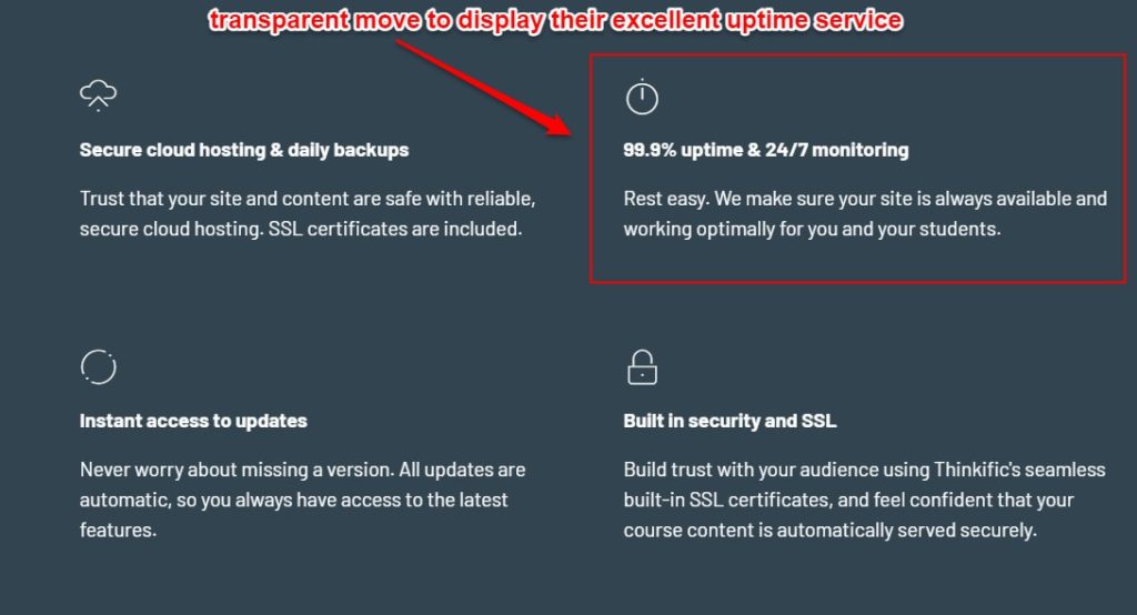 Both Teachable and Thinkific have similar security measures and uptime guarantees in place. It’s a tie when it comes to this. But personally, I am leaning towards Thinkific because of their transparent move to display the 99.9% uptime figure on their website. Teachable shows no such number.