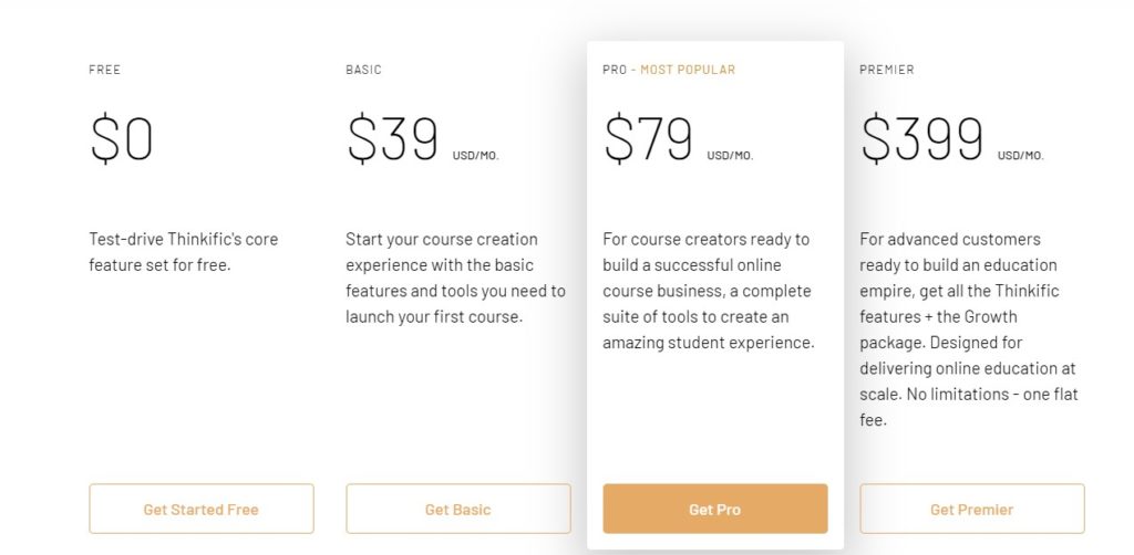 With Thinkific, the paid plans begin at $39/month charged annually. Going for their annual membership (instead of monthly) saves you 20% on the charge.