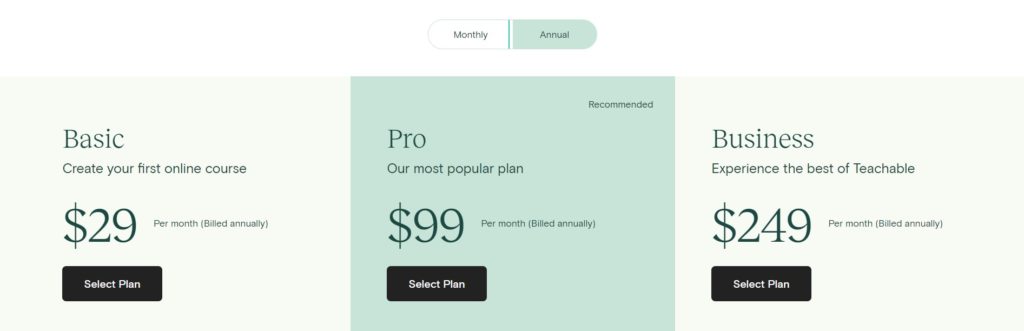 Teachable also offers you a discount on annual payments. The basic plan begins at $29/month. The basic plan at Thinkific and Teachable share a lot of the same features. An important thing to note here though is that Teachable has a transaction fee of 5% on their basic plan. Thinkific has no transaction fee on any of their plans.