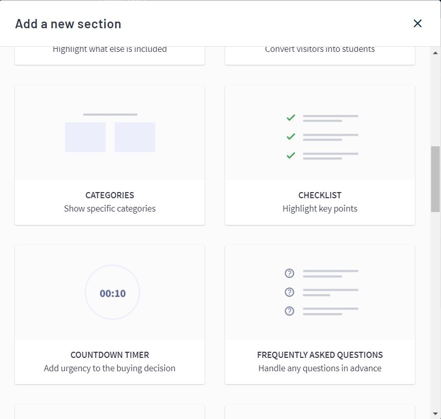 With Thinkific, you can add countdown timers, different types of testimonials, checklists, upsells, videos, instructors about blocks, etc. None of these advanced features are available at Teachable.