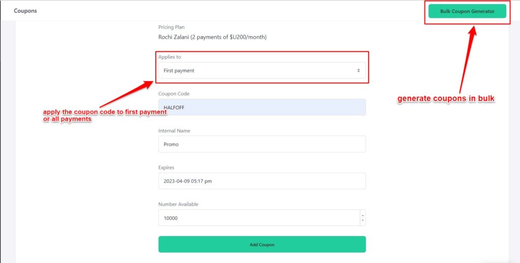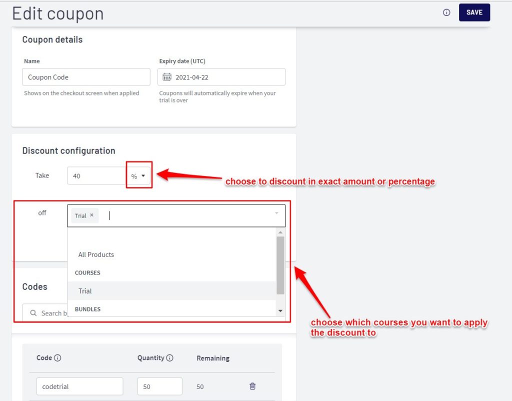 Creating a coupon allows you to give discounts to your potential buyers. You might want to use this when a customer buys multiple courses from you or you want the first 500 people to get a discount and leverage that sale.