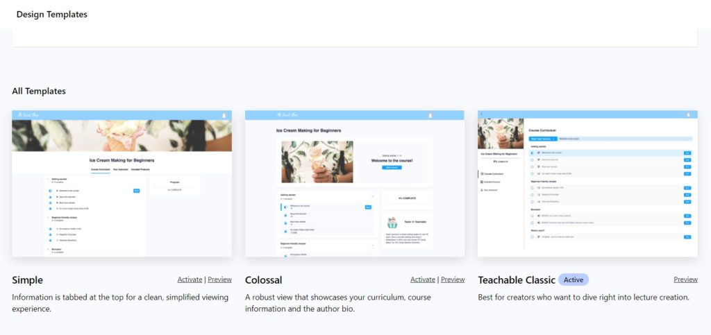 Thinkific offers 3 themes in 3-4 styles that give you a lot of freedom to customize your site. The “Theme” builder in Thinkific only allows you to add a brand logo, choose the font family, and customize the colors. There are premade page templates that can help you get started quicker, but there’s little you can do in customizing your site theme.