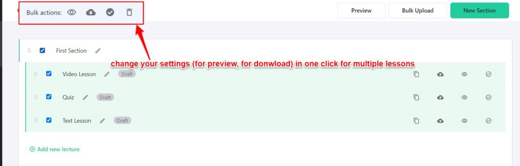 Teachable also allows you to change the course settings in bulk. This is a quicker way than Thinkific, where you have to manually change your settings for each lesson.