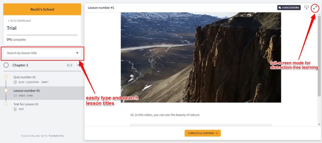 | Course Player For Students | Easily search lessons, Has a full-screen mode | Offers an iOS App | Thinkific | ||