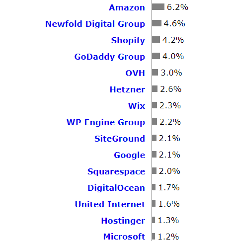 Amazon Web Services is the leading web hosting service provider with a share of 6.3%, while tech giants Google, considered one of Amazon’s biggest rivals, only ranks 10th. (W3Techs)