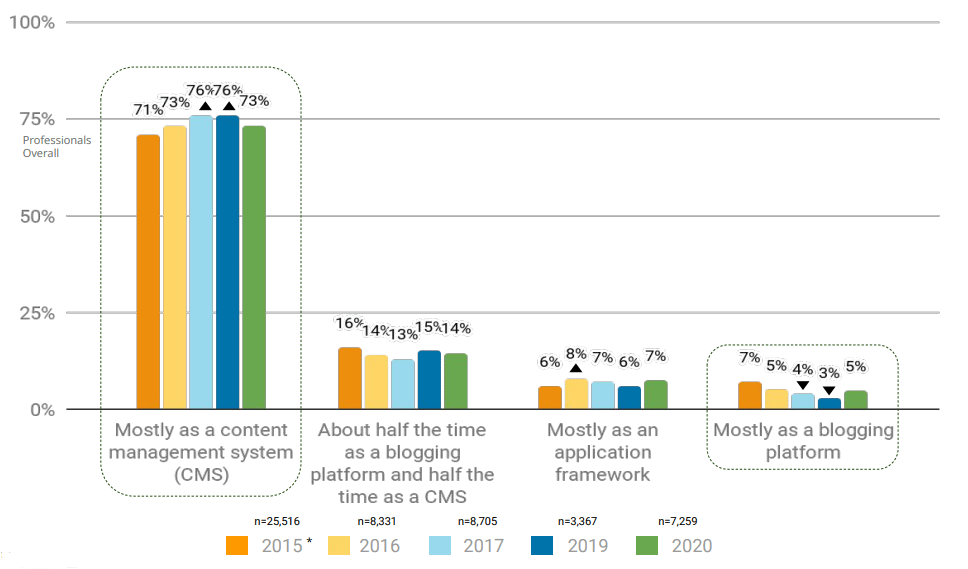 4. 73% of professionals prefer WordPress as a CMS (73%) in 2020, compared to 76% in 2019 and 2018. (WordPress 2020 Annual Survey)