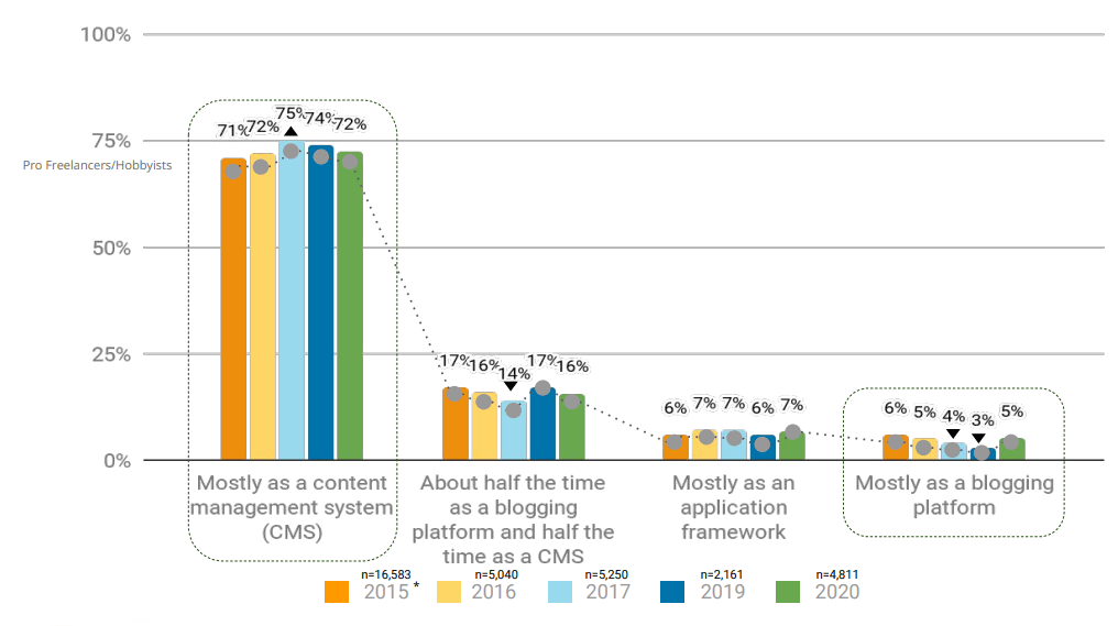5. Nearly three-quarters (72%) of Pro Freelancers/Hobbyists use WordPress as a CMS. (WordPress 2020 Annual Survey)
