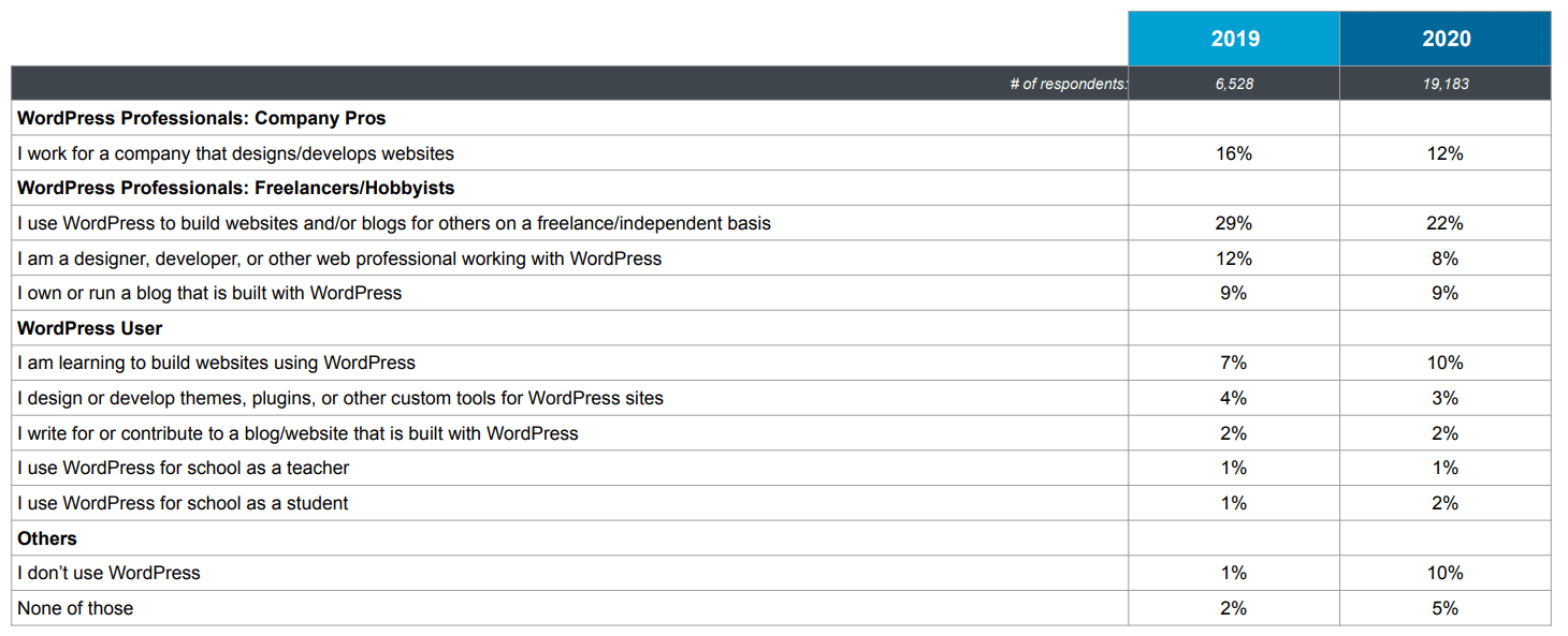 6. WordPress is mostly used on a freelance basis (22%). (WordPress 2020 Annual Survey)