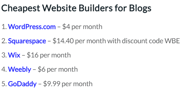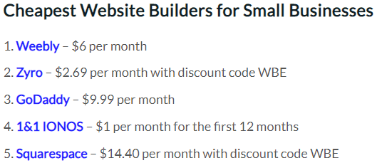 3. WordPress, at $4 per month, is the cheapest blog website builder in terms of their paid plan, while Weebly is the cheapest for small businesses at $6 per month (WebsiteBuilderExpert)