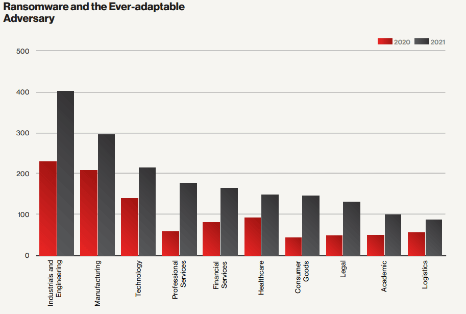 3. Industrials and Engineering industries had the highest number of ransomware attacks in 2021. (CrowdStrike)