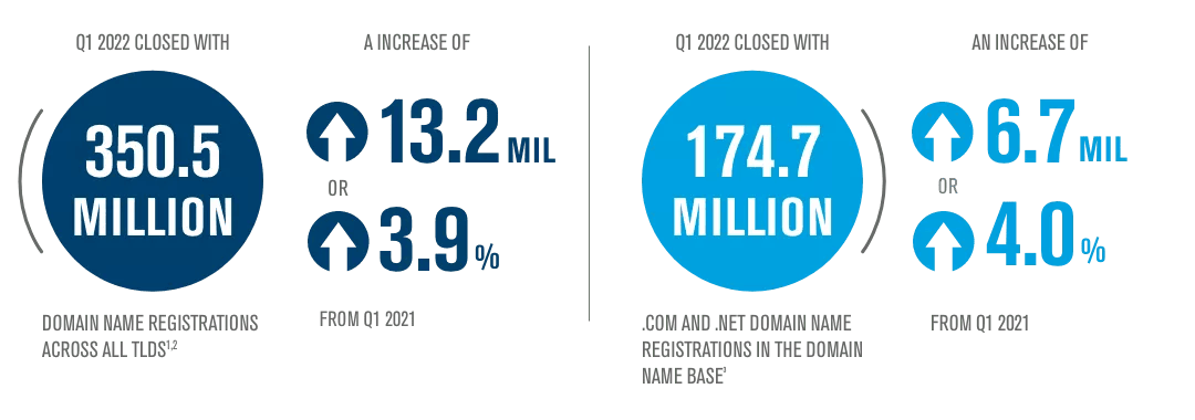 1. The first quarter of 2022 closed with 350.5 million domain name registrations across all top-level domains, an increase of 8.8 million domain name registrations, or 2.6%, compared to the fourth quarter of 2021. (Verisign)