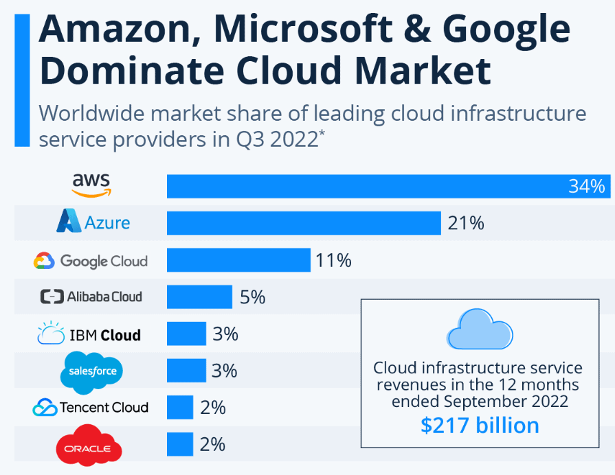 2. AWS is the biggest cloud provider by global web hosting market share, while Azure and Google Cloud Platform follow in second and third spots, respectively. (Synergy Research Group)