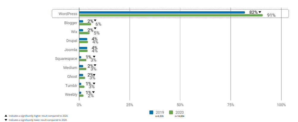 2. WordPress continues to be the preferred platform (91%) for the next website project. (WordPress 2020 Annual Survey)