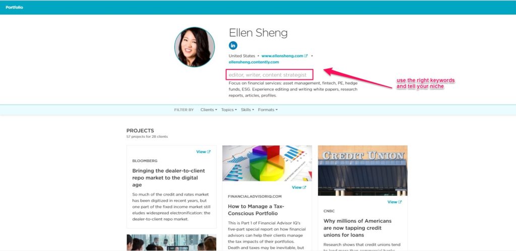 Ellen Shang is an editor, writer, and content strategist, with her niche focusing on financial services. Her Contently portfolio is perfect because it lays out the keywords of her profile, her niche, and her LinkedIn.