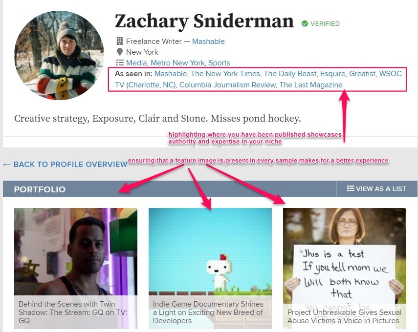 Zachary Sniderman is a freelance writer at Mashable. When potential clients hunt her portfolio on Muck Rack, they immediately see her accomplishments and where she has been published. It also helps to ensure there’s a featured image attached to your samples.
