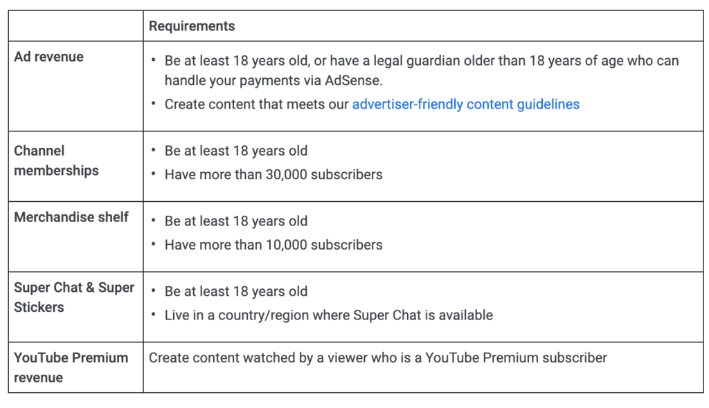 While it might feel nice to get accepted into YPP, know that there’s work to do if you want to monetize beyond the most basic income stream of ads. Advanced monetization features such as channel memberships and selling your merchandise have bigger thresholds. To gain access to them, here’s a preview of their eligibility criterion: