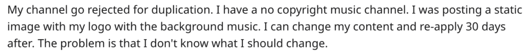 Here’s an example message I found on the YouTube subreddit where the creator got rejected for duplication and they were unsure what they did wrong.
